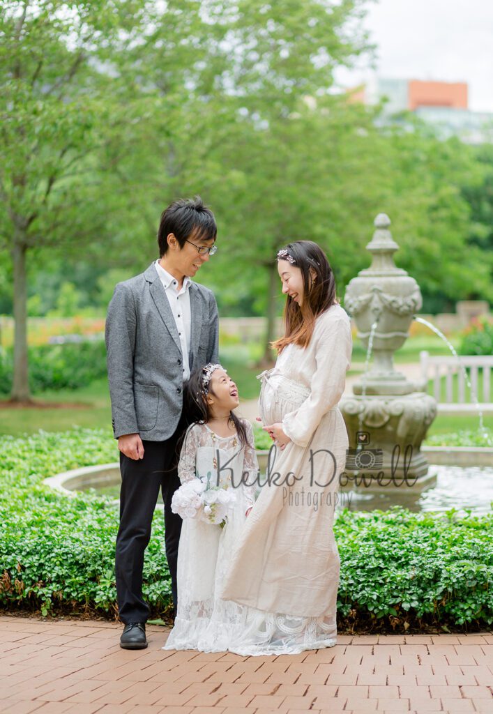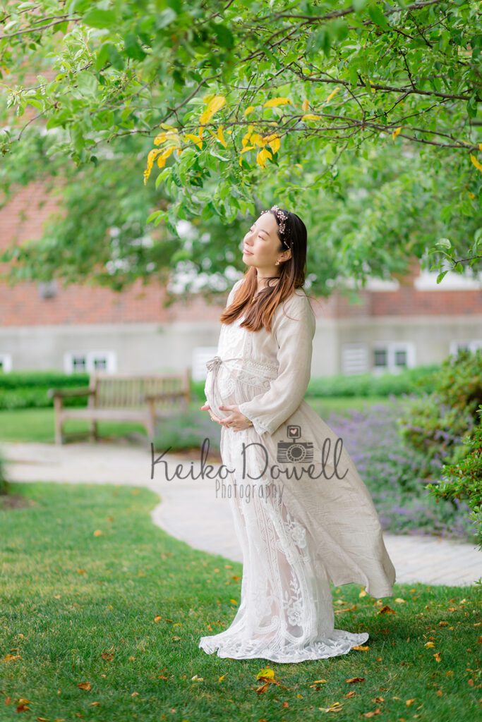 自然や花に囲まれて、ガーデンウェディングのような雰囲気でマタニティ写真を残したい、というリクエストで、今回はご自宅アパート周辺とご近所のローカルパークでの撮影でブルックラインに行ってきました。お話に伺っていた通り、お庭がとってもきれいに手入れされていて季節のお花も美しく咲いていたので場所を変えながらたくさん写真を残すことができました。